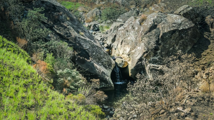 Once at the top of the hill, walk straight down for about 50m, take off your backpacks (you will come back to this point) and head to your right going down the hill, after 200m's you will reach Sherry Cave (new). This cave in summer should have some water otherwise you carry it up from the hill you climbed a bit earlier if planning to sleep here for the night. The view's of the Drakensberg and valley below from the cave are stunning.